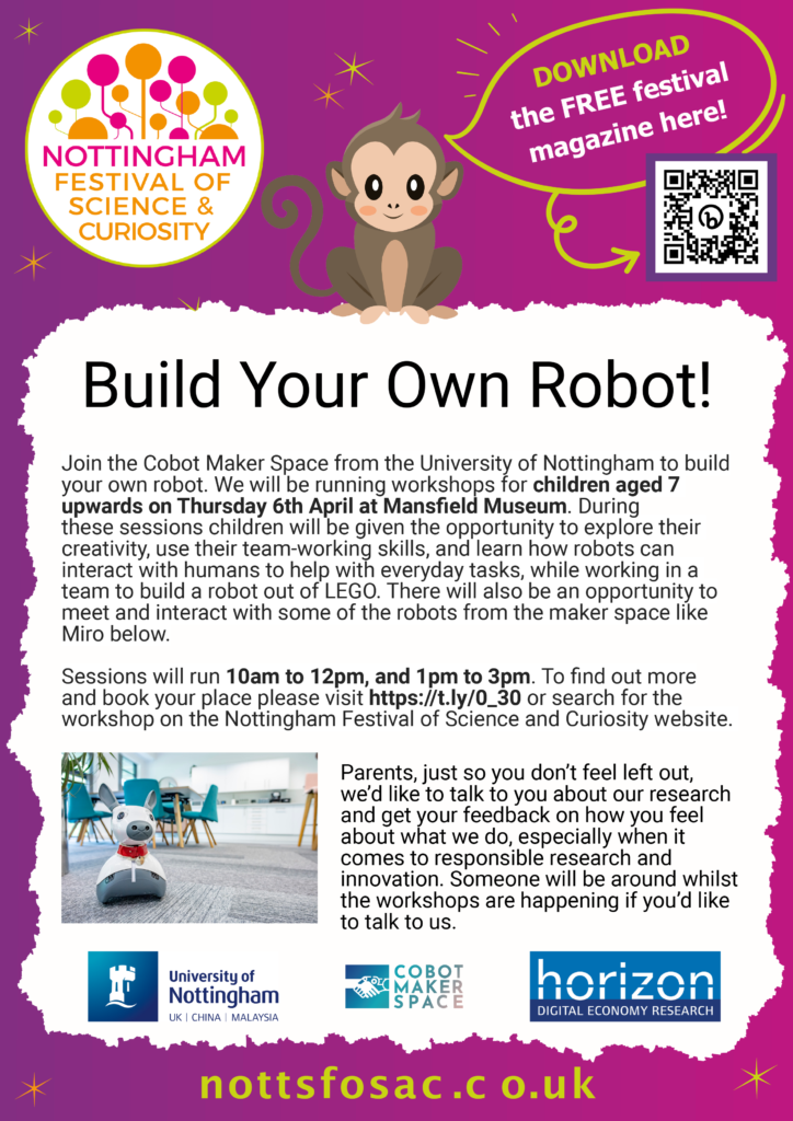 Sessions for children aged 7 upwards will run from 10am to 12pm and 1pm to 3pm. During these sessions children will explore their creativity, use their team-working skills and learn how robots can interact with humans to help with every day tasks. There will also be an opportunity to meet some of the robots from the Cobot Maker Space. Places on sessions must be booked prior to attendance. Please book here.